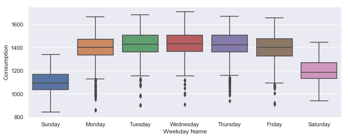 If we're dealing with a sequence of strings all in the same date/time format, we can explicitly specify it with the In addition to Timestamp and DatetimeIndex objects representing individual points in time, pandas also includes data structures representing durations (e.g., 125 seconds) and periods (e.g., the month of November 2018). For more about these data structures, there is a nice summary here. In this tutorial we will use DatetimeIndexes, the most common data structure for pandas time series. To work with time series data in pandas, we use a DatetimeIndex as the index for our DataFrame (or Series). Let's see how to do this with our OPSD data set. First, we use the The DataFrame has 4383 rows, covering the period from January 1, 2006 through December 31, 2017. To see what the data looks like, let's use the Next, let's check out the data types of each column. Now that the Alternatively, we can consolidate the above steps into a single line, using the Now that our DataFrame's index is a DatetimeIndex, we can use all of pandas' powerful time-based indexing to wrangle and analyze our data, as we shall see in the following sections. Another useful aspect of the DatetimeIndex is that the individual date/time components are all available as attributes such as One of the most powerful and convenient features of pandas time series is time-based indexing — using dates and times to intuitively organize and access our data. With time-based indexing, we can use date/time formatted strings to select data in our DataFrame with the For example, we can select data for a single day using a string such as We can also select a slice of days, such as Another very handy feature of pandas time series is partial-string indexing, where we can select all date/times which partially match a given string. For example, we can select the entire year 2006 with With pandas and matplotlib, we can easily visualize our time series data. In this section, we'll cover a few examples and some useful customizations for our time series plots. First, let's import matplotlib. We'll use seaborn styling for our plots, and let's adjust the default figure size to an appropriate shape for time series plots. Let's create a line plot of the full time series of Germany's daily electricity consumption, using the DataFrame's We can see that the We can already see some interesting patterns emerge: All three time series clearly exhibit periodicity—often referred to as seasonality in time series analysis—in which a pattern repeats again and again at regular time intervals. The Seasonality can also occur on other time scales. The plot above suggests there may be some weekly seasonality in Germany's electricity consumption, corresponding with weekdays and weekends. Let's plot the time series in a single year to investigate further. Now we can clearly see the weekly oscillations. Another interesting feature that becomes apparent at this level of granularity is the drastic decrease in electricity consumption in early January and late December, during the holidays. Let's zoom in further and look at just January and February. As we suspected, consumption is highest on weekdays and lowest on weekends. To better visualize the weekly seasonality in electricity consumption in the plot above, it would be nice to have vertical gridlines on a weekly time scale (instead of on the first day of each month). We can customize our plot with matplotlib.dates, so let's import that module. Because date/time ticks are handled a bit differently in matplotlib.dates compared with the DataFrame's Now we have vertical gridlines and nicely formatted tick labels on each Monday, so we can easily tell which days are weekdays and weekends. There are many other ways to visualize time series, depending on what patterns you're trying to explore — scatter plots, heatmaps, histograms, and so on. We'll see other visualization examples in the following sections, including visualizations of time series data that has been transformed in some way, such as aggregated or smoothed data. Next, let's further explore the seasonality of our data with box plots, using seaborn's These box plots confirm the yearly seasonality that we saw in earlier plots and provide some additional insights: Next, let's group the electricity consumption time series by day of the week, to explore weekly seasonality. As expected, electricity consumption is significantly higher on weekdays than on weekends. The low outliers on weekdays are presumably during holidays. This section has provided a brief introduction to time series seasonality. As we will see later, applying a rolling window to the data can also help to visualize seasonality on different time scales. Other techniques for analyzing seasonality include autocorrelation plots, which plot the correlation coefficients of the time series with itself at different time lags. Time series with strong seasonality can often be well represented with models that decompose the signal into seasonality and a long-term trend, and these models can be used to forecast future values of the time series. A simple example of such a model is classical seasonal decomposition, as demonstrated in this tutorial. A more sophisticated example is as Facebook's Prophet model, which uses curve fitting to decompose the time series, taking into account seasonality on multiple time scales, holiday effects, abrupt changepoints, and long-term trends, as demonstrated in this tutorial. When the data points of a time series are uniformly spaced in time (e.g., hourly, daily, monthly, etc.), the time series can be associated with a frequency in pandas. For example, let's use the The resulting DatetimeIndex has an attribute As another example, let's create a date range at hourly frequency, specifying the start date and number of periods, instead of the start date and end date. Now let's take another look at the DatetimeIndex of our We can see that it has no frequency ( If we know that