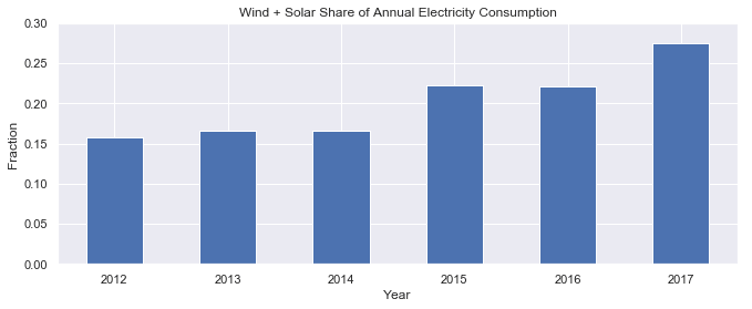 ax.set_title('Wind + Solar Share of Annual Electricity Consumption')