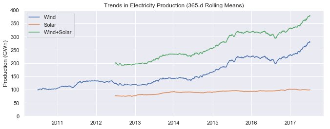 ax.set_title('Trends in Electricity Production (365-d Rolling Means)');